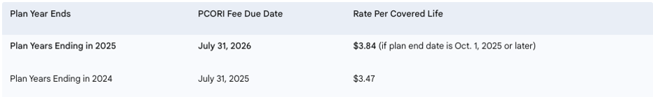 The PCORI fee is increasing to $3.84 per covered life. This new rate applies to plan years that end on or after October 1, 2025, and before October 1, 2026.